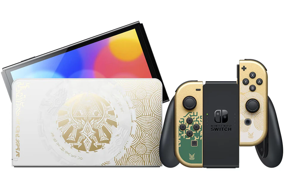 In secondo luogo, per l’occasione è stata anche distribuita (già disponibile sul mercato da un paio di settimane) una console serigrafata, dedicata al nuovo capitolo di Zelda: una elegante edizione che presenta un design composto da diversi elementi grafici che appaiono all’interno di The Legend of Zelda: Tears of the Kingdom, tra cui il noto stemma di Hylia della serie sulla parte anteriore della base. Tra le varie possibilità, Nintendo ha scelto di distribuire il modello OLED, con schermo 7 pollici dotato di questa tecnologia fatta di colori intensi e contrasto elevato, nonché di un ampio stand regolabile, di una base con porta LAN cablata, di 64 GB di memoria interna e di un audio migliorato in modalità portatile e da tavolo. Il colpo d’occhio, con i JoyCon dorati, è senza dubbio di grande impatto!
