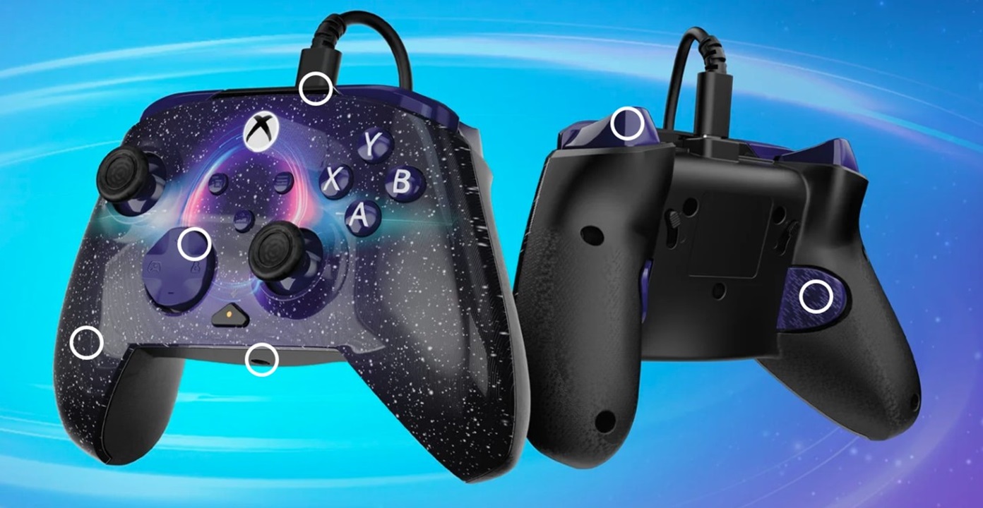 Dal punto di vista ergonomico, il Turtle Beach Rematch Wired Dark Cosmos offre una presa immediatamente confortevole e un’ottima solidità generale, grazie a un corpo centrale dalle linee compatte e bilanciate. Il peso, leggermente inferiore rispetto al controller ufficiale Xbox, contribuisce a un comfort elevato durante le sessioni prolungate, riducendo l’affaticamento senza dare la sensazione di vuoto tipica di alcuni modelli economici. Le impugnature, rivestite da una texture gommata efficace, assicurano stabilità anche nei momenti più concitati, mentre la curvatura posteriore segue bene la naturale forma delle mani. I pulsanti frontali e i trigger a corsa breve con effetto Hall si dimostrano precisi e reattivi, con una resistenza calibrata che ricorda molto da vicino quella del pad ufficiale Xbox, sebbene leggermente più “clicky” nel feedback tattile. Anche gli stick analogici offrono un buon controllo, con un ritorno centrale affidabile e movimenti fluidi, ideali per gli shooter o i giochi d’azione più dinamici. L’unico neo nella gestione dei comandi riguarda i pulsanti aggiuntivi sul dorso, mappabili e utili in teoria, ma a volte troppo sensibili: capita di attivarli involontariamente, compromettendo l’azione in momenti cruciali. È un dettaglio che richiede un po’ di adattamento, ma che può risultare fastidioso per chi cerca precisione assoluta. Nel complesso, il Dark Cosmos si pone come una via di mezzo equilibrata tra il comfort dell’originale Xbox Controller e la personalizzazione dei modelli wireless Turtle Beach, mantenendo un ottimo compromesso tra ergonomia e controllo.