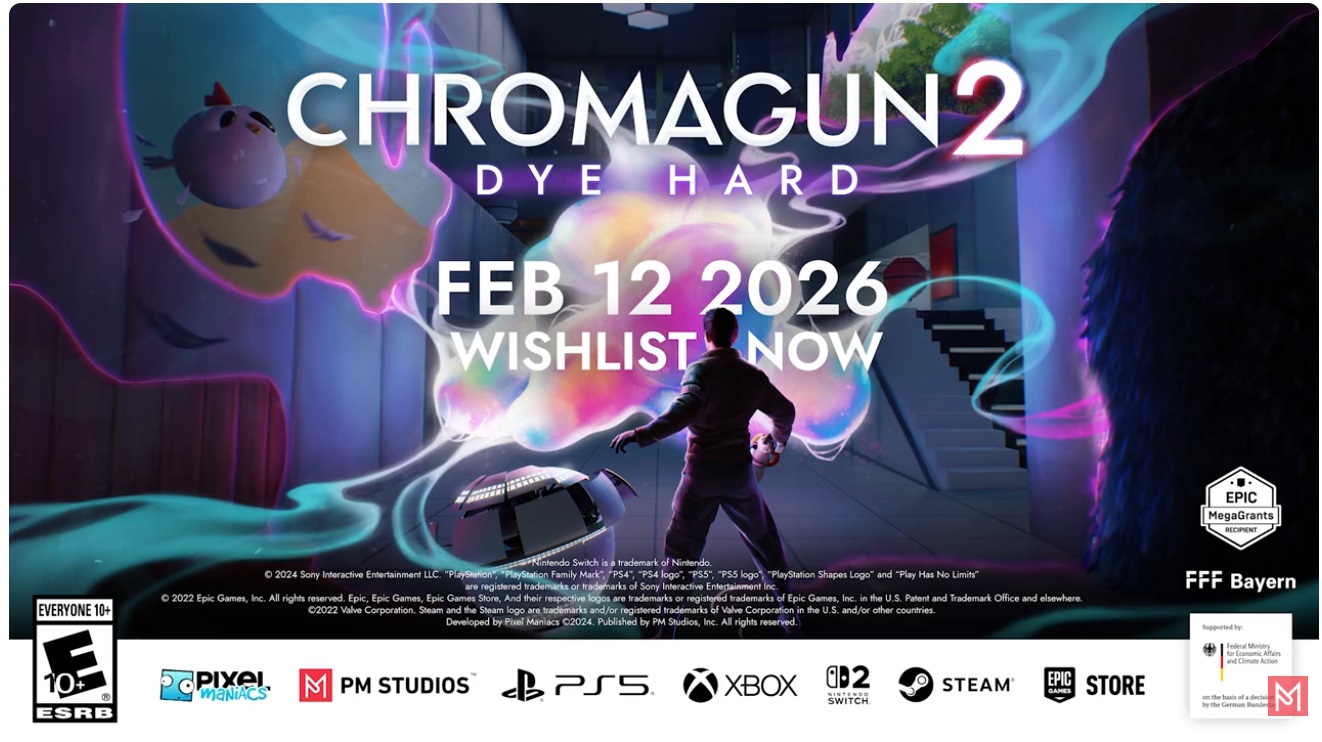 Pixel Maniacs™ e PM Studios™ sono entusiasti di annunciare la data di lancio ufficiale a livello mondiale del loro avvincente e avvincente sparatutto rompicapo, ChromaGun 2: Dye Hard. Il gioco sarà disponibile su tutte le principali piattaforme: PC (tramite Steam ed Epic Games Store) in formato digitale, PlayStation®5, Xbox Series X|S e Nintendo Switch™2, sia in formato digitale che in versione retail, il 12 febbraio 2026. I preordini per le versioni retail sono ora aperti.