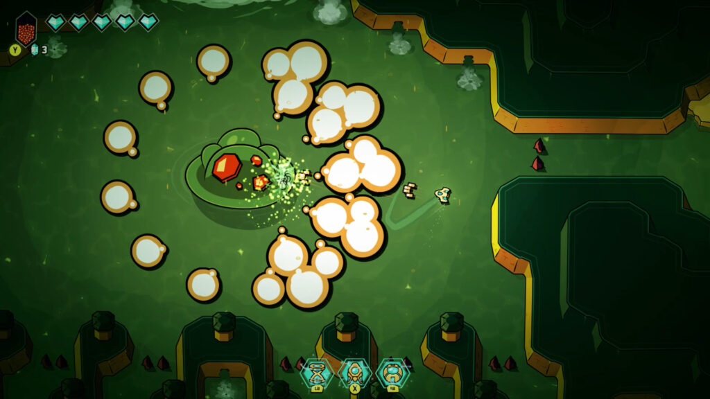 La struttura dell’esperienza ruota attorno a una mappa aperta e progressivamente interconnessa. Il giocatore si muove liberamente tra pianure, grotte, rovine e templi sotterranei, scoprendo passaggi segreti, scorciatoie e nuove aree man mano che acquisisce abilità aggiuntive. Ad esempio inizialmente anche una piccola roccia è un ostacolo insormontabile, non appena sbloccata la prima arma potremo sbriciolarla; lo stesso vale per dei salti che inizialmente sono per noi impossibili, perlomeno fin quando non sbloccheremo il boost e così via. L’impostazione richiama quella dei primi Zelda, con un mondo che inizialmente appare ostile e poco comprensibile ma che con il tempo diventa familiare. Ogni regione nasconde puzzle ambientali, segreti e potenziamenti utili sia per il combattimento sia per l’esplorazione. Il piacere deriva proprio dal processo di scoperta: tornare in una zona già visitata e accorgersi che un nuovo potere permette di accedere a un passaggio prima irraggiungibile crea quella sensazione di progressione organica che caratterizza i migliori giochi d’avventura. La grande particolarità di Minishoot’ Adventures riguarda però il modo in cui si combatte. Tutta l’azione è gestita attraverso un sistema twin-stick: una levetta controlla il movimento della navicella, l’altra la direzione del fuoco. Lo schema ricorda gli shooter arcade e conferisce agli scontri un ritmo estremamente dinamico. I nemici attaccano spesso con pattern di proiettili elaborati, trasformando molte battaglie in piccoli esercizi di schivata e precisione. Questo elemento avvicina il gioco alla tradizione del bullet hell, anche se il livello di difficoltà rimane calibrato per un pubblico ampio. I combattimenti contro i boss rappresentano il momento in cui questa filosofia emerge con maggiore chiarezza: arene chiuse, proiettili che riempiono lo schermo e movimenti millimetrici necessari per sopravvivere.