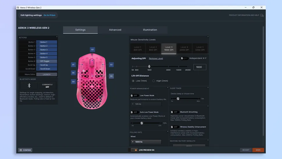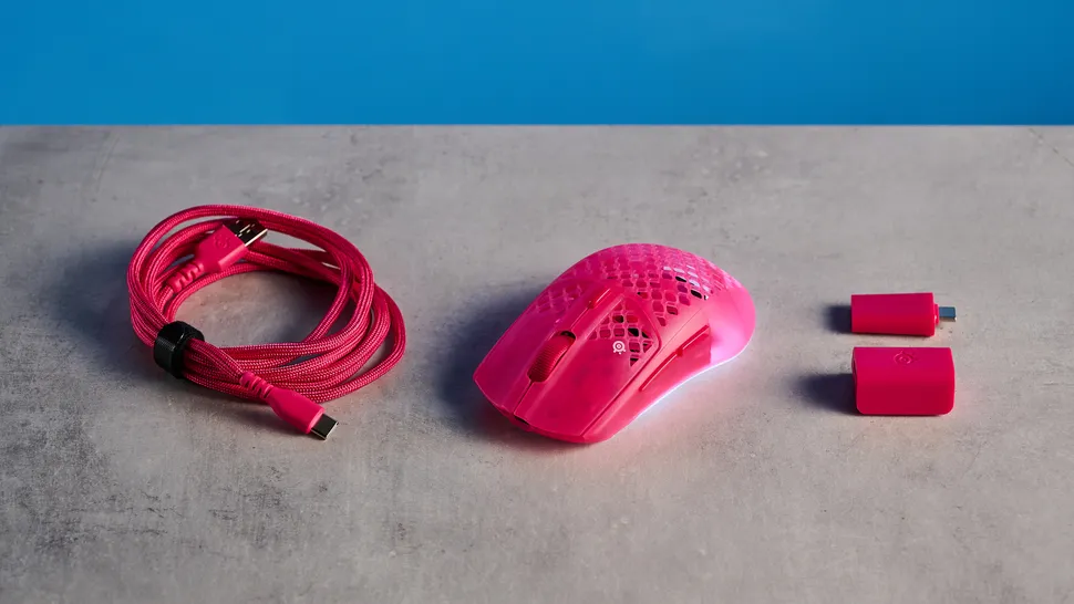 Una volta ultimati i preparativi, è giunto il momento di approfondire cosa offra realmente Aerox 3 Gen2. Gli switch dei tasti sono stati cambiati, rendendo il click più soddisfacente e definito, ma l’aggiunta più sentita dai possessori del modello precedente è sicuramente il miglioramento dei due tasti laterali, leggermente più grandi e sporgenti. Proseguendo in ambito di percezione fisica del prodotto, la scocca è praticamente uguale al modello precedente, in solido PBT di ottima qualità con finitura ruvida. Seppure sicuramente presenti le caratteristiche tattili di un prodotto premium, personalmente non sposo la scelta di optare per una plastica semitrasparente, che, unita al motivo a nido d’ape forato, restituisce all’occhio meno di quello che si percepisce al tocco. È possibile acquistare l’Aerox 3 Gen 2 nei colori nero, bianco e magenta. Per quanto riguarda gli aspetti pratici dell’utilizzo in ambito gaming, il discorso si fa sicuramente più tecnico e i miglioramenti elevano notevolmente il nuovo Gen 2 rispetto al modello precedente. Con un peso di 68 grammi, l’Aerox 3 Gen 2 si classifica a buon titolo tra i mouse ultraleggeri, in linea con il suo predecessore, pregio accentuato anche dagli ottimi skate, che gli permettono di scivolare agilmente sul tappetino. Il nuovo sensore Truemove 26k permette di raggiungere 26000 DPI, superando i 18000 del “Gen 1”, ma a fare davvero le differenza è l’aumento del polling rate, la frequenza di aggiornamento del puntatore, che da 1000Hz arriva a 4000Hz. Le nuove impostazioni per il polling rate sono 2000 e 4000Hz, queste consentono di abbassare la latenza dell’input dagli 1.8 ms dei 1000hz ai 1.2 ms, garantendo maggiore responsività nel gaming competitivo, solo per i titoli che supportano un elevato polling rate (miglioramento davvero percepibile se si possiede un monitor con alta frequenza di aggiornamento). Le migliorie non si esauriscono però con l’estetica e il feedback di gioco, l’Aerox 3 Gen 2 presenta anche una durata della batteria abbastanza sorprendente, ancora più sorprendente se utilizzato con luci disattivate a 1000hz in wireless 2.4 GHz, permettendo un utilizzo di circa 120 ore tra una ricarica e l’altra, 200 se collegato con Bluetooth. Consigliatissima anche la nuova modalità Low Power per un utilizzo desk, potenzialmente capace di estendere ulteriormente la durata della batteria. Ad ogni modo, se chiedete a me, la cosa più emozionante è stata constatare la velocità di ricarica, davvero sbalorditiva, vi assicuro che non rischierete mai di rimanere “a piedi”. In coda mi sembra importante menzionare anche il miglioramento della stabilità della connessione Bluetooth, l’introduzione di due settaggi che regolano a quale distanza dal tappetino si disattivi il segnale del mouse e la certificazione IP54 per resistenza a polvere e acqua.